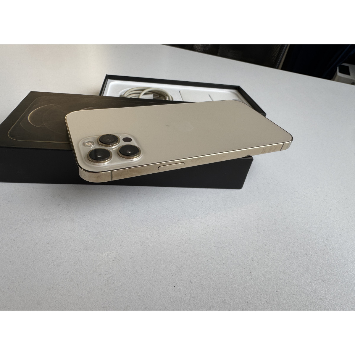 iPhone 12 Pro Max 256 Гб Золотой вв состоянии 5-/5. Мелкие следы пользования рамке корпуса, дисплей в отличном состоянии. Установили новый аккумулятор, ёмкость 100%. Полный комплект аксессуаров.