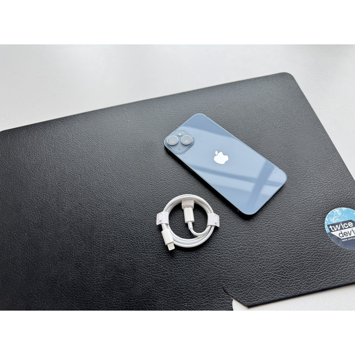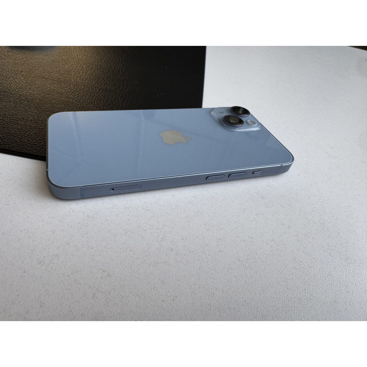 iPhone 14 128 Голубой в состоянии 5-/5. Есть мелкие следы пользования по заднему стеклу, дисплей в отличном состоянии. Установили новый аккумулятор, ёмкость 100%. В комплекте провод для быстро зарядки.