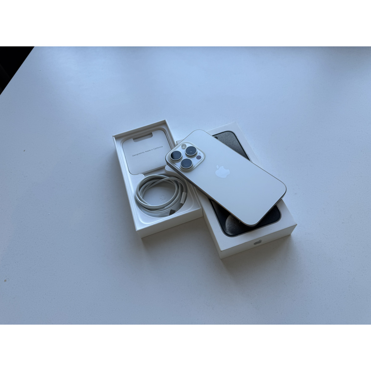 iPhone 15 Pro 128 Гб Белый титан в состоянии 5/5. Девайс в отличном состоянии, всегда был под защитными аксессуарами. Максимальная емкость аккумулятора - 89%. Полный комплект аксессуаров