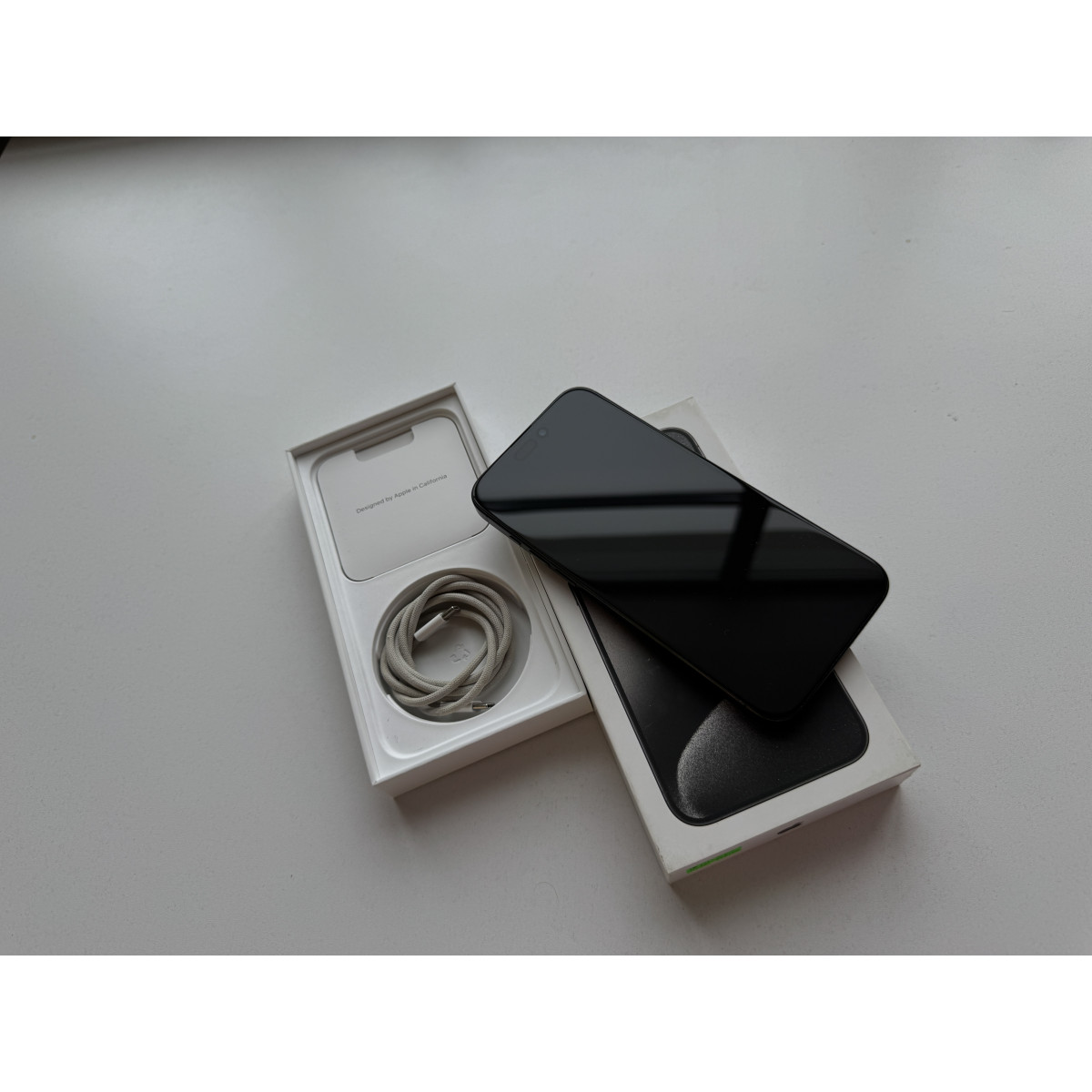 iPhone 15 Pro Max 256 Гб Черный титан состоянии 5-/5. Есть незначительные следы по стеклу камеры, дисплей в отличном состоянии. Максимальная емкость аккумулятора - 87%. Полный комплект.