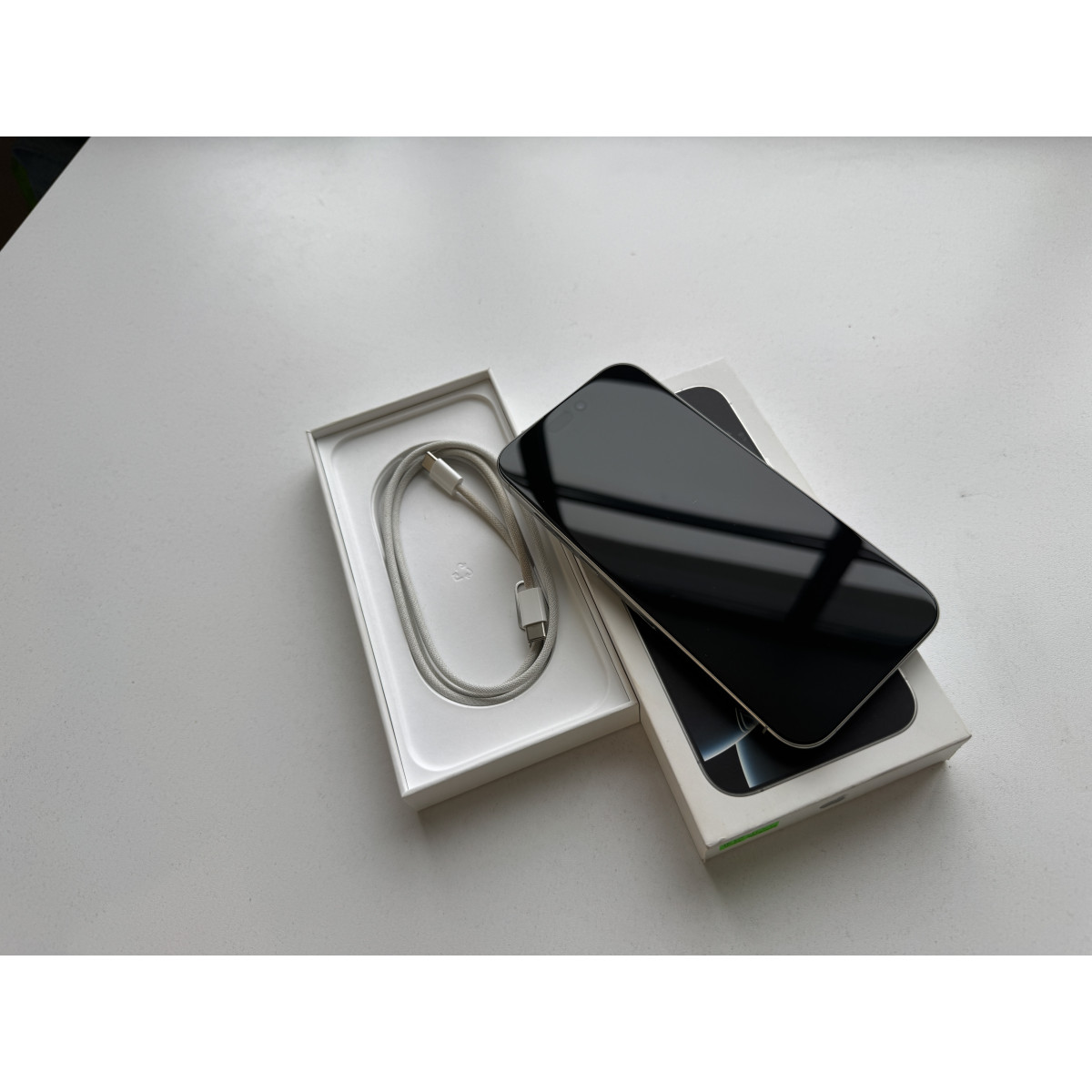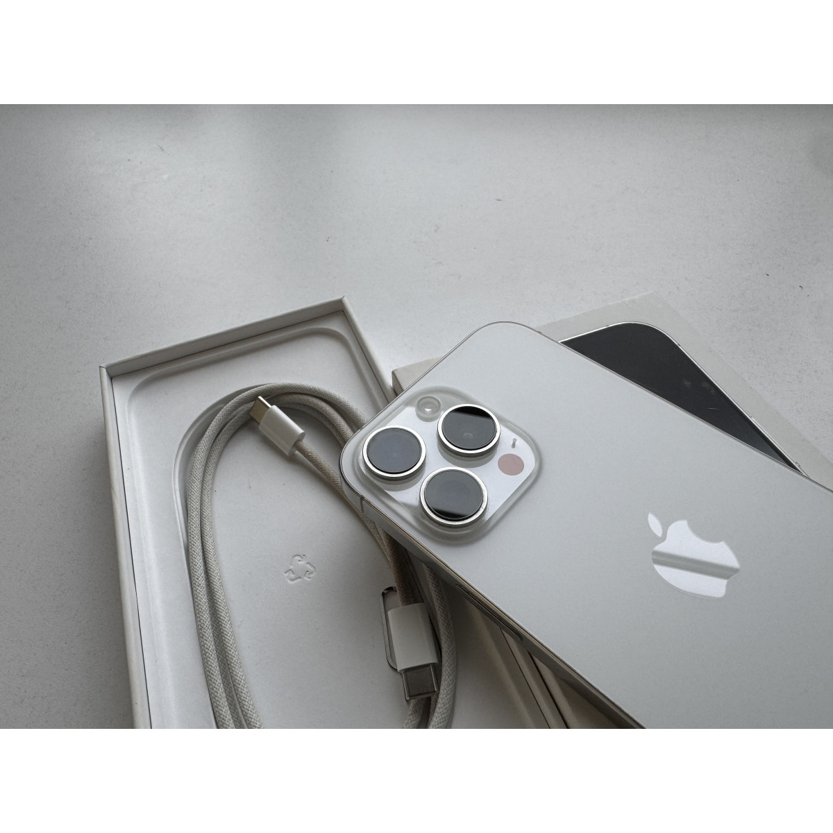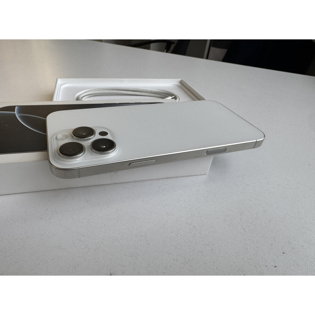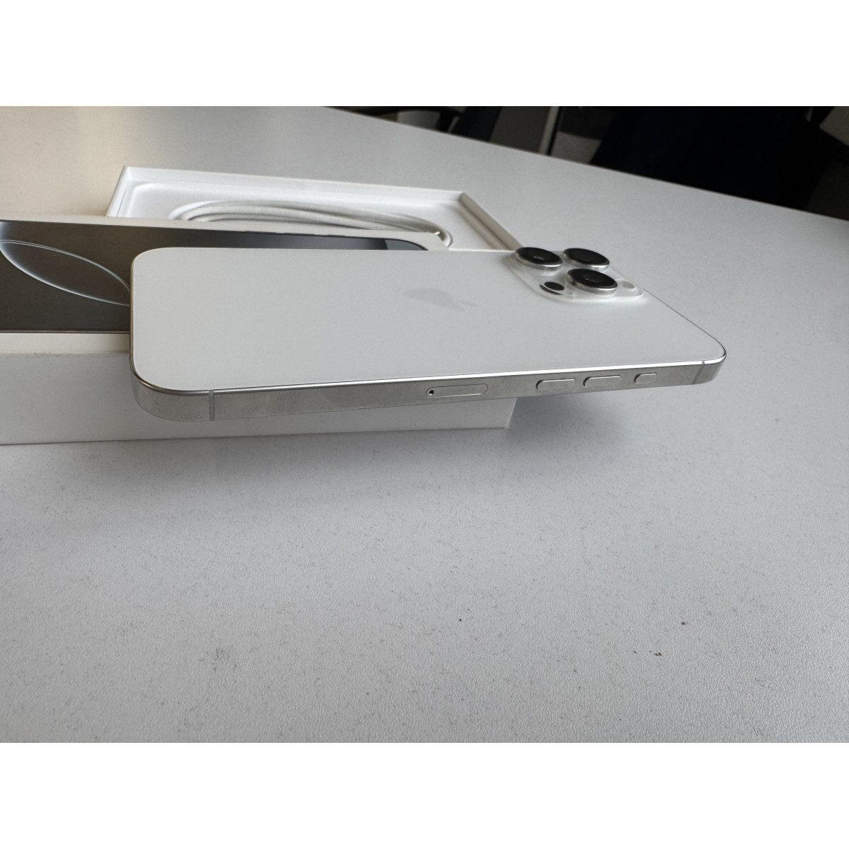 iPhone 16 Pro Max 512 Гб Белый титан в состоянии 5-/5. По дисплею есть незначительные следы, корпус и заднее стекло в отличном состоянии. Максимальная емкость аккумулятора - 100%. Полный комплект аксессуаров.