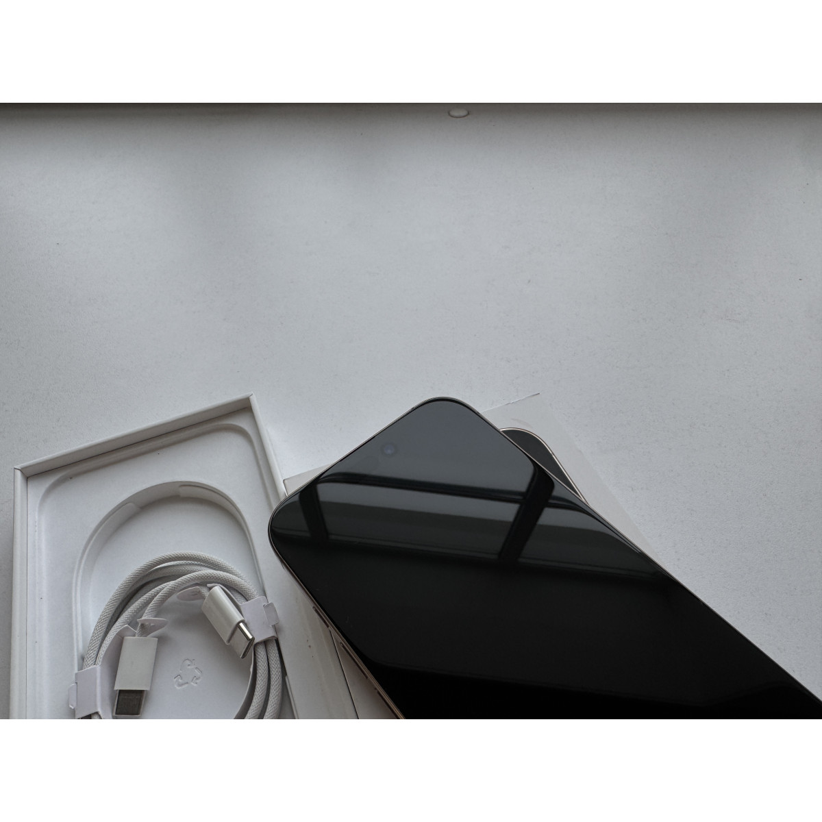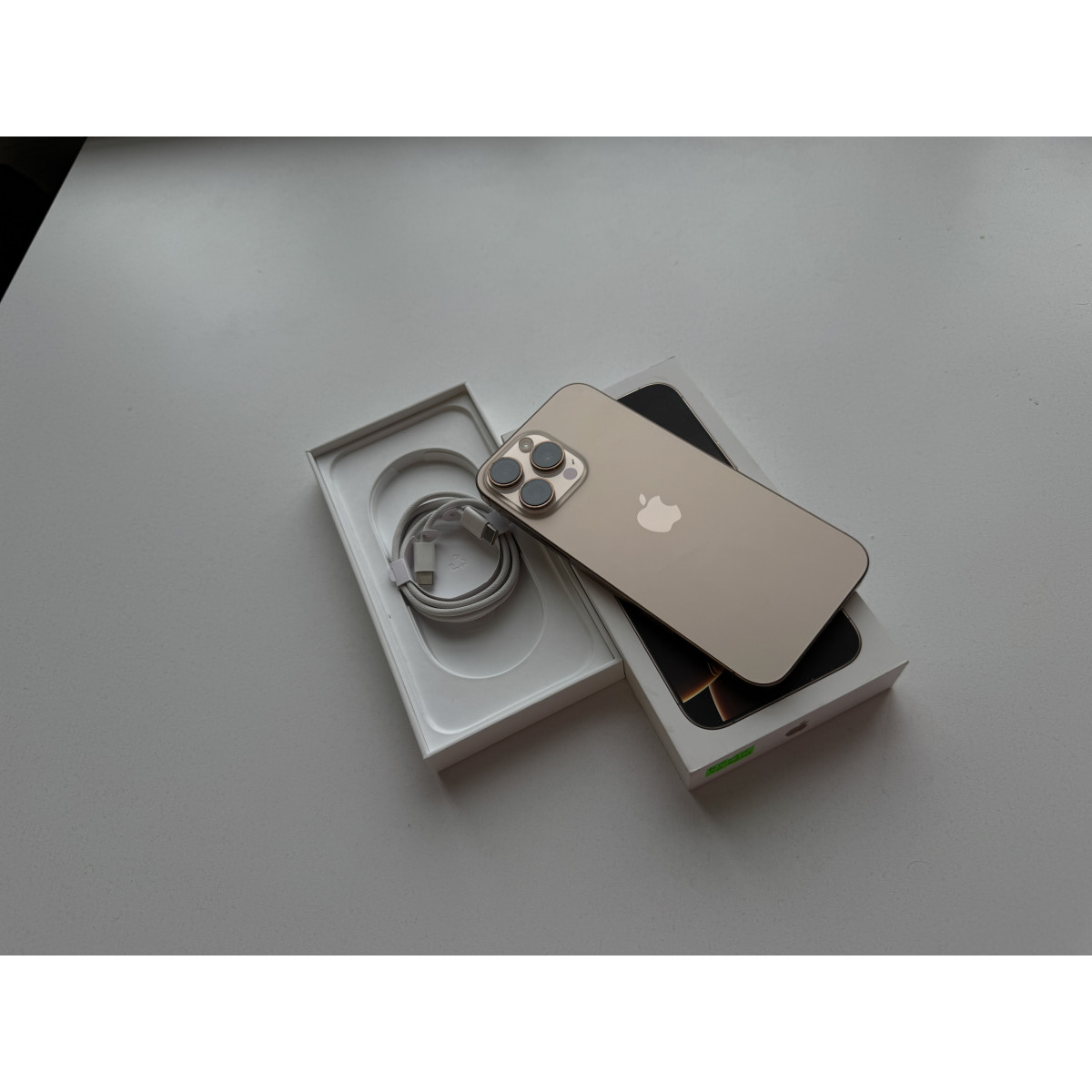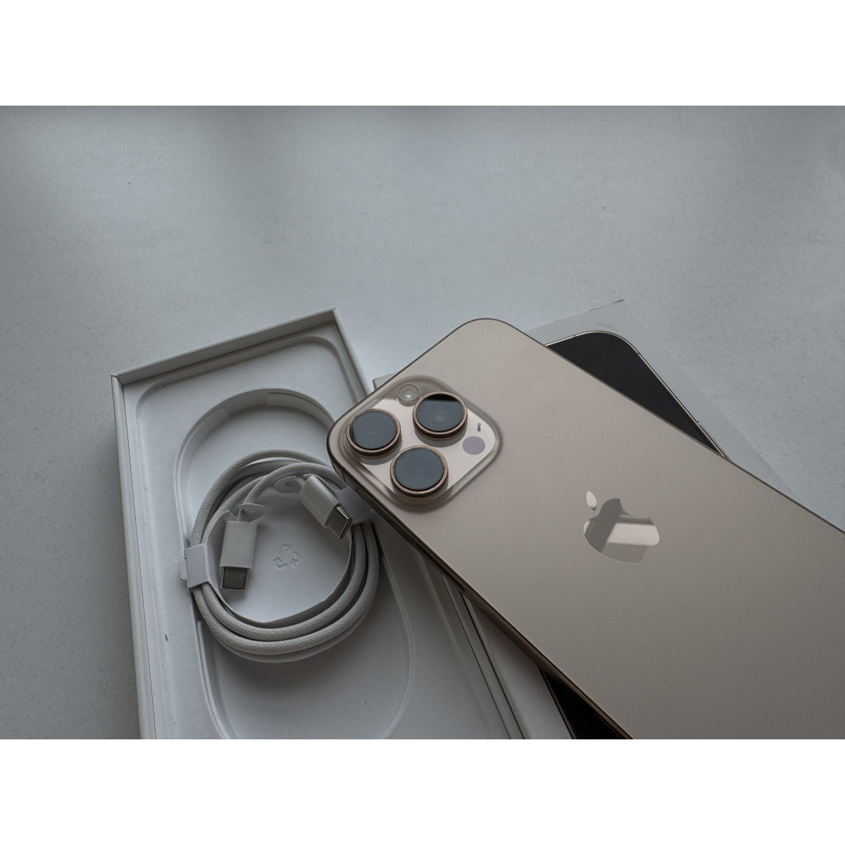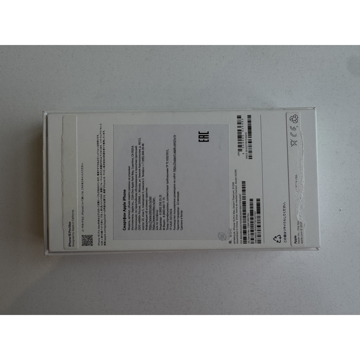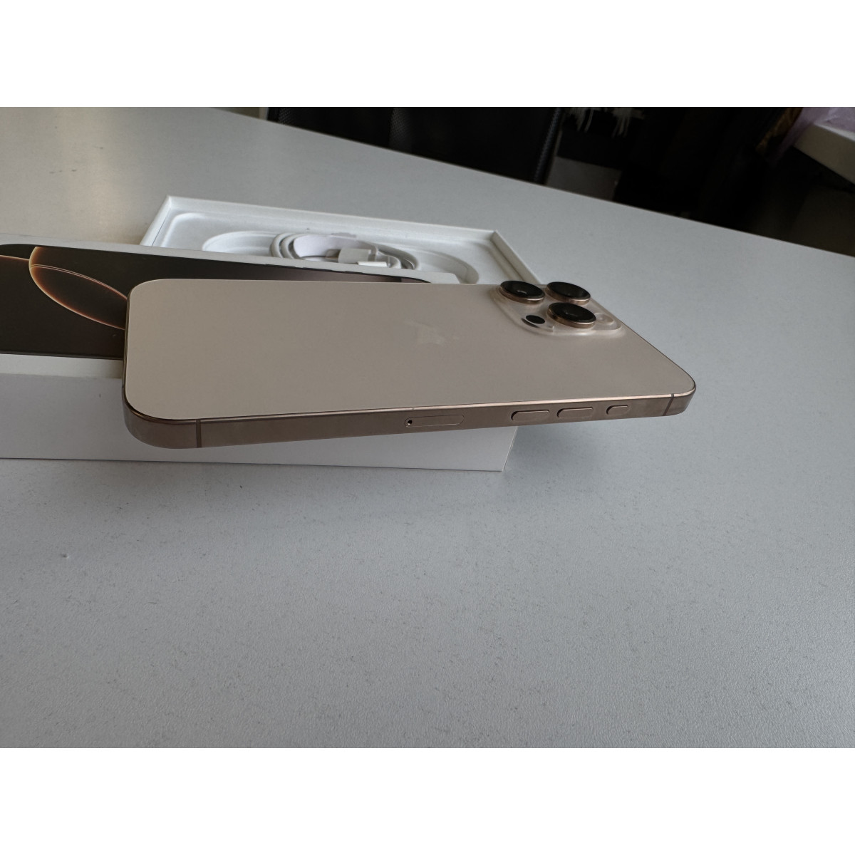 iPhone 16 Pro Max 512 Гб Пустынный титан в состоянии 5-/5. Состояние близко к отличному, пара еле заметных следов на дисплее. Ёмкость аккумулятора - 93%. Полный комплект аксессуаров.