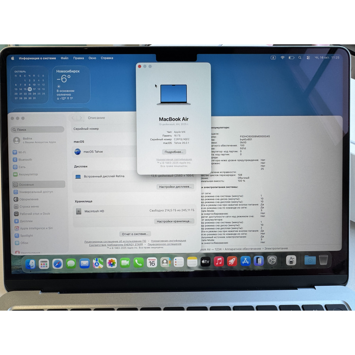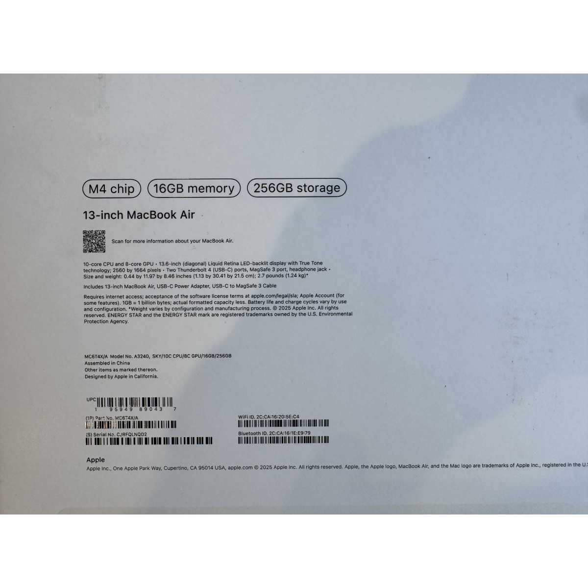 Macbook Air 13" 2025 256 Gb Небесно-голубой Apple M4 16 Gb RAM состоянии 5-/5. Незначительные следы пользования по макбуку, технически полностью исправен. Всего 108 циклов перезарядки аккумулятора (100% ёмкость). Полный комплект аксессуаров.